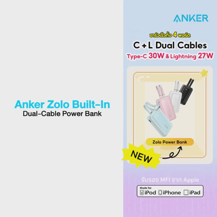 🎗️Anker Zolo Power Bank (สายชาร์จ USB-C และ Lighting ในตัว 10000mAh 30W)🎗️
