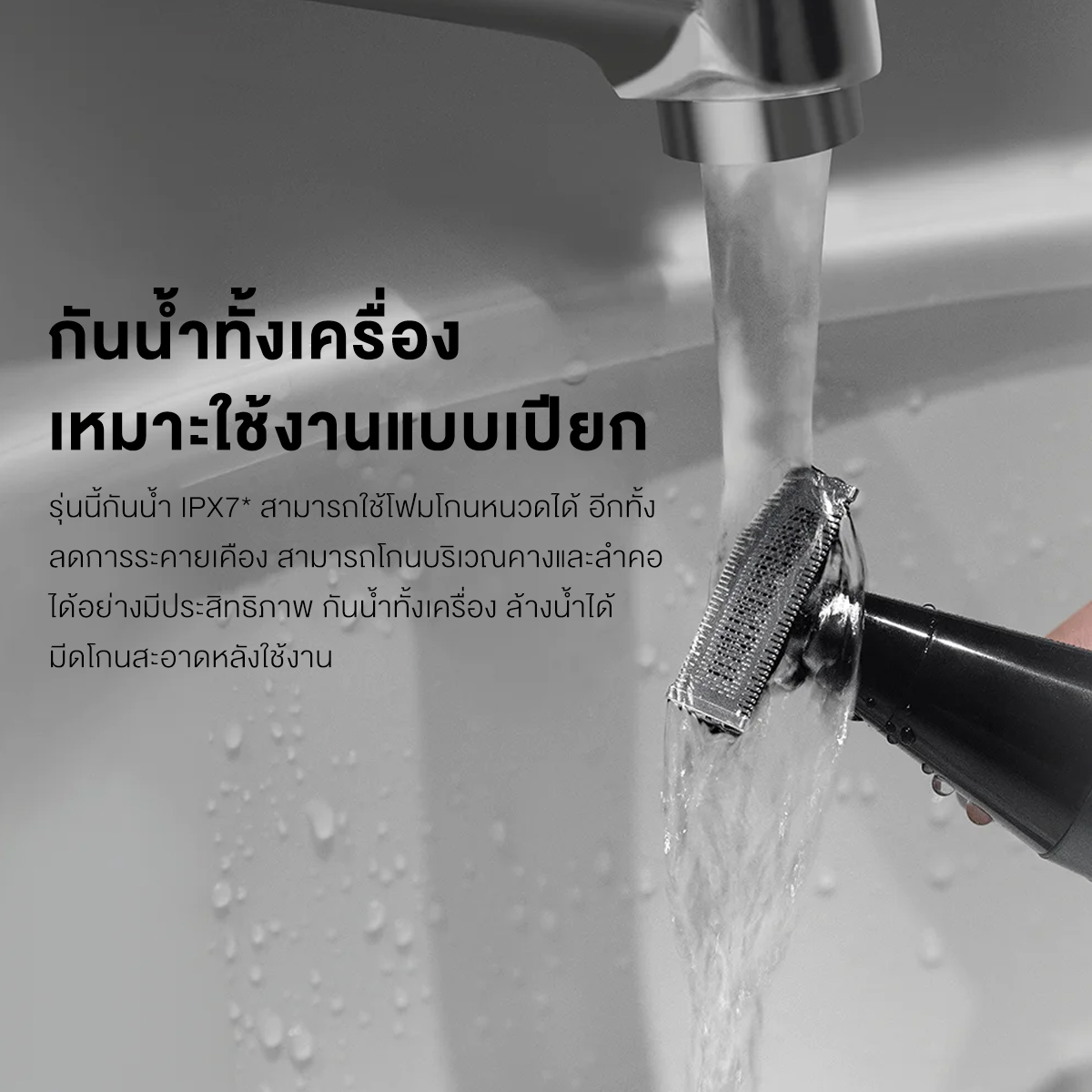 อุปกรณ์เครื่องนี้กันน้ำระดับ IPX7* ช่วยให้คุณโกนแบบเปียกด้วยโฟมโกนหนวดได้โดยเกิดการระคายเคืองน้อยที่สุด ใบมีดมอบผลลัพธ์ที่สมบูรณ์แบบแม้บริเวณที่เข้าถึงยากอย่างคางและลำคอ ล้างได้ทั้งเครื่องเพราะตัวเครื่องกันน้ำได้เพื่อความสะอาดและอนามัยหลังใช้งา
